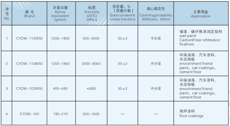 | 水性環(huán)氧樹脂   水性環(huán)氧樹脂突出優(yōu)點(diǎn)是以水代替有機(jī)溶劑,低VOC,且能在室溫和超市條件下固化,有合理的固化時(shí)間,特別是能和水泥砂漿、混凝土等常用的水泥基材料混合使用,增強(qiáng)防水性能,并且保證很高的交聯(lián)密度,其他水性聚合物體系無(wú)法比擬。   Waterborne epoxy resin   Waterborne epoxy resin outstanding advantages in water instead of organic solvent, low VOC, and can be cured at room temperature and under the condition of the supermarket, have reasonable cure time, especially with common cement base material such as cement mortar, concrete mixture and enhance the waterproof performance, and ensure high crosslinking density, other water-based polymer system.   產(chǎn)品技術(shù)指標(biāo):Specifications: