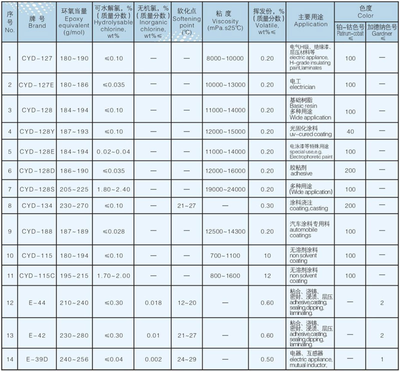 Colorless or light yellow viscous fluid, mainly used in coating, adhesive, corrosion protection, electrical insulation, laminate, casting and other fields, also can be used as high-grade epoxy resin processing raw materials.