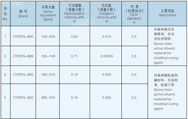 Cydpg-660 (butyl glycidyl ether) and 669 (ethylene glycol diglycidyl ether) diluents are non-toxic, harmless and highly dilutive, suitable for epoxy resin adhesives, pouring, coatings and solvent-free paints.